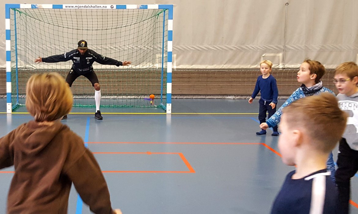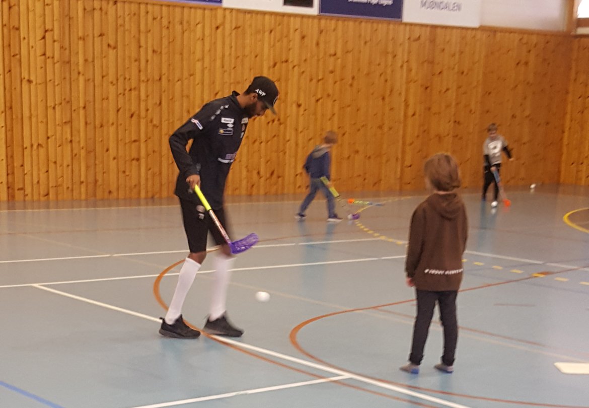 Denne uka var Amahl Pellegrino en av de som var på besøk. I løpet av en time har han blitt utfordra på balanseøvelser, innebandy og ikke minst fotball av 40 ivrige gutter og jenter.