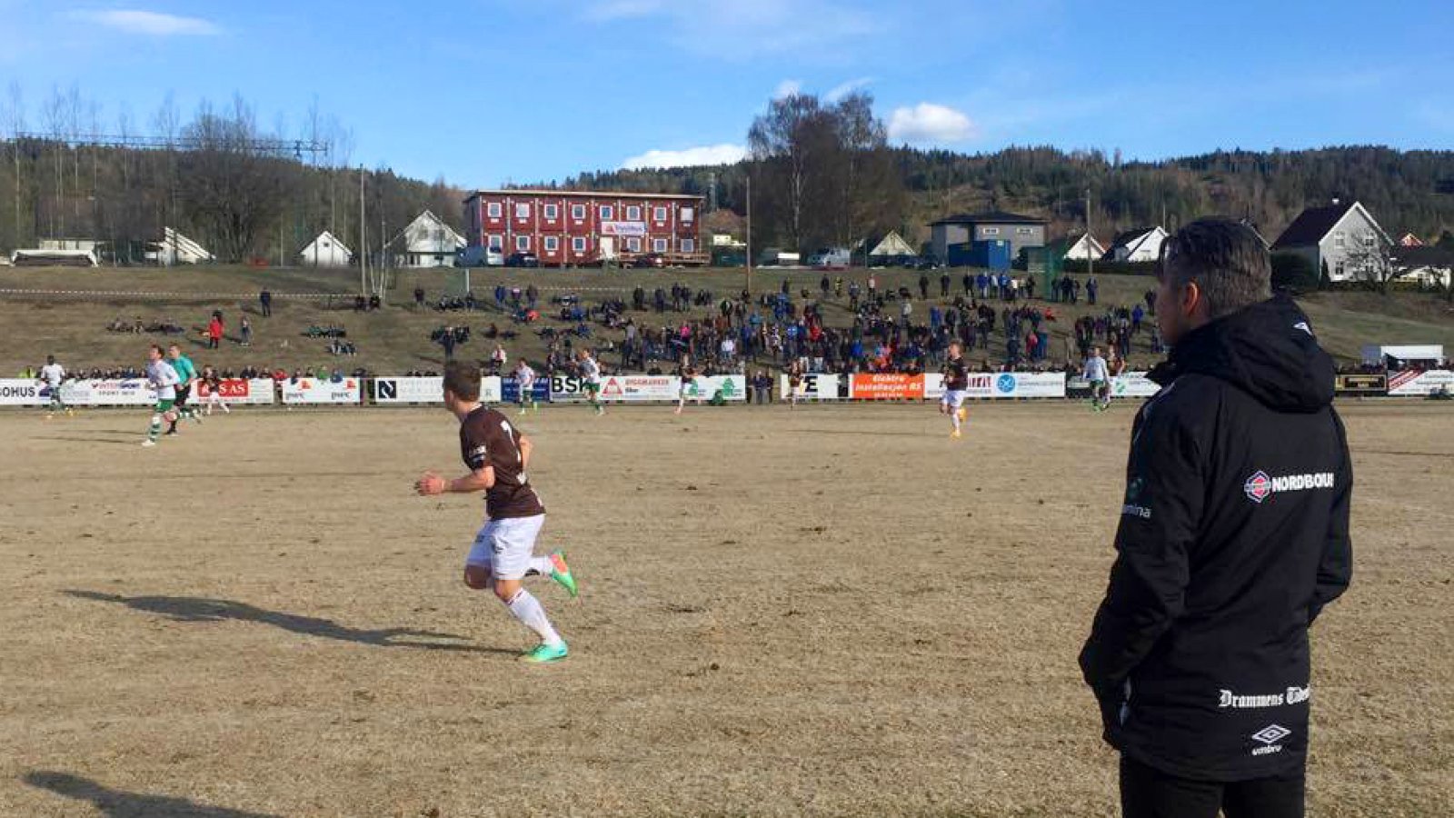 Vestfossen hadde noen spede forsøk på corner uten å true Bokwe mellom stengene. Utover i første omgang kom de brune nærmere og nærmere et ledermål og med kun to minutter til pause satt den til slutt. Et godt slått frispark fra Henrik Gulden traff panna til Sondre Solhom på femmeteren og kula gikk over Vestfossen-keeperen og i mål.